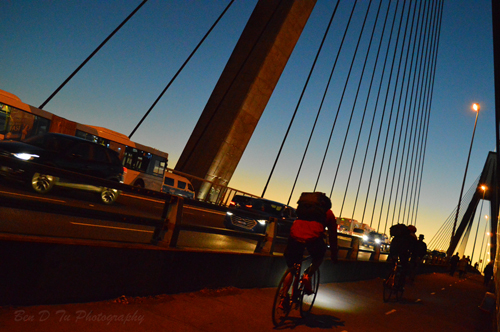 在拍攝期間, 我發現另一個意外的惊喜, 我沒有數, 但估計可能有超过百輛的单車,几乎是同一時間從悉尼市的方向走过大橋, 這突然其來的人群, 來勢匈匈, 令大橋充滿了生氣, 我想騎士們都在悉尼市工作, 下斑後, 他們令可踏单車回家, 也不塔乘公車.,,,悉尼人熱愛生活, 非常懂得享受人生, 要活得快樂, 我想健康比任何事情都重要.